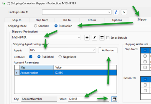Select Production Shipping mode, and a Shipper configuration.
